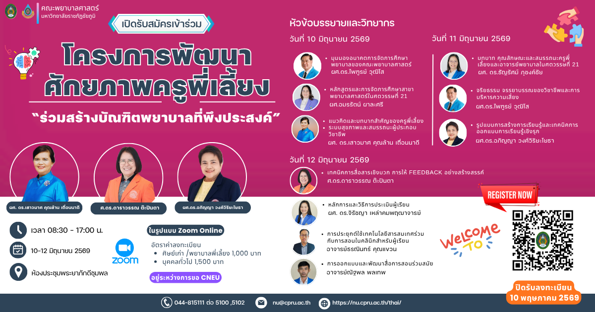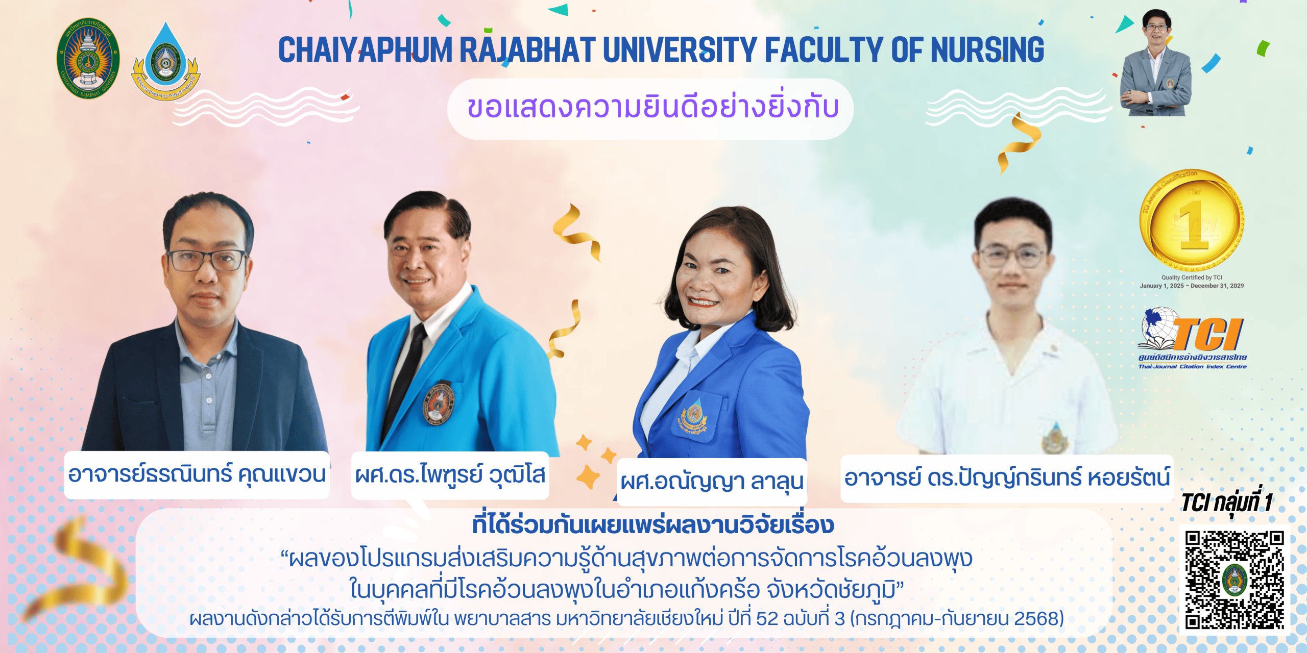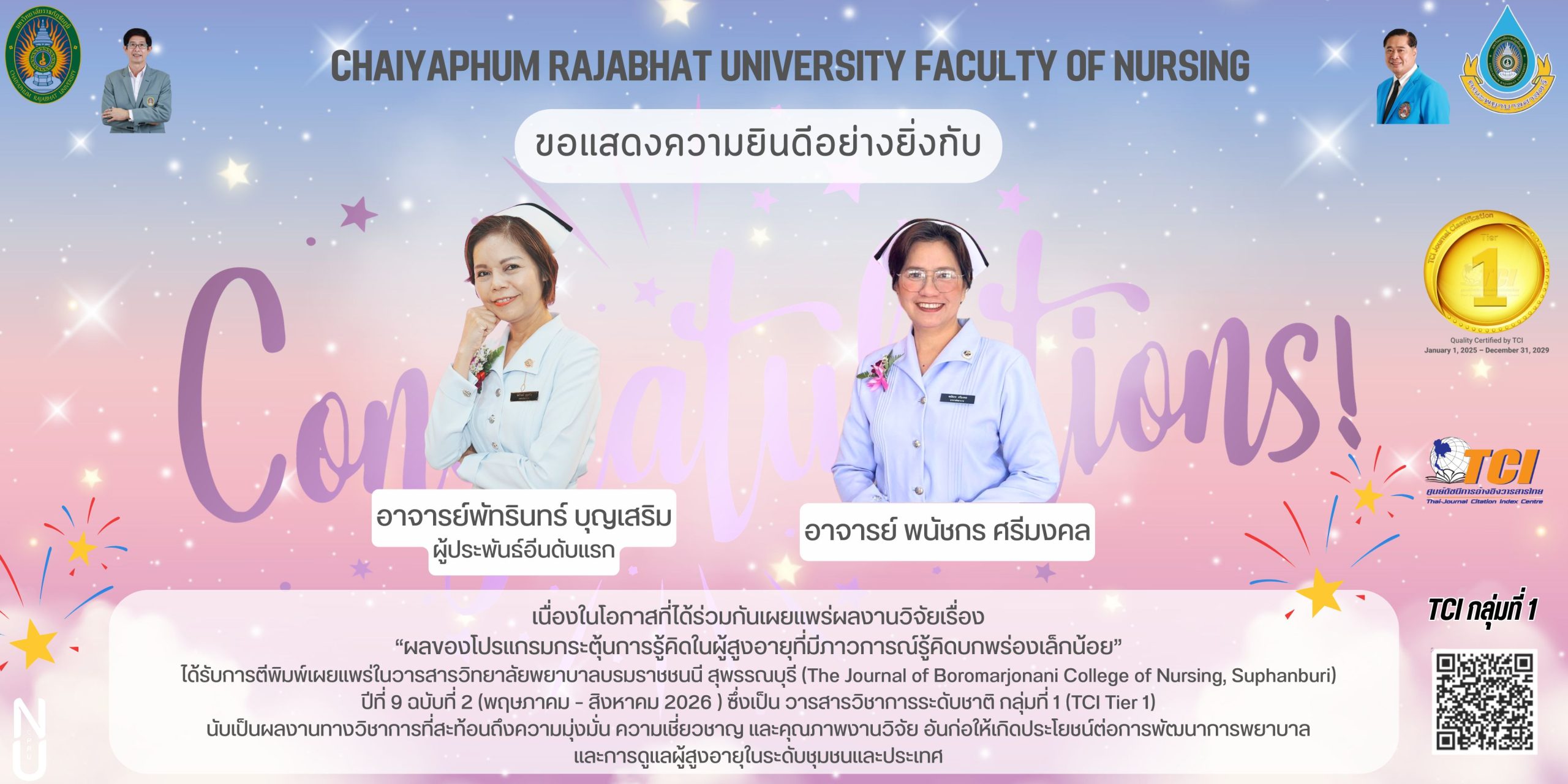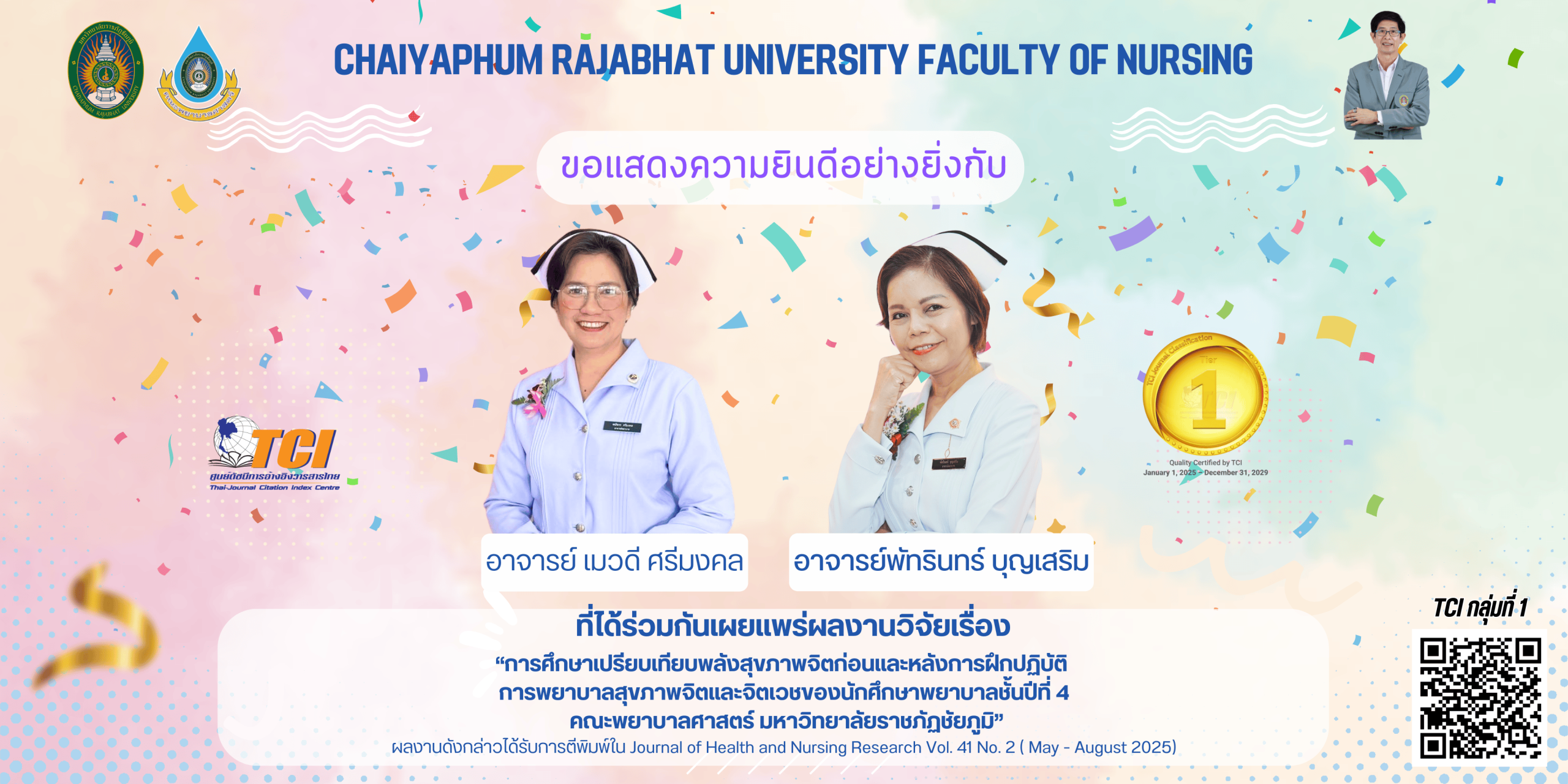คณะพยาบาลศาสตร์ มหาวิทยาลัยราชภัฏชัยภูมิ167 หมู่ 2 ตำบลนาฝายอำเภอเมือง จังหวัดชัยภูมิ 36000044-815111 ต่อ 5100 ,5102nu@cpru.ac.th