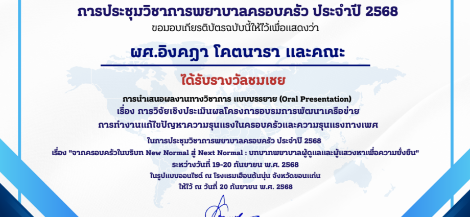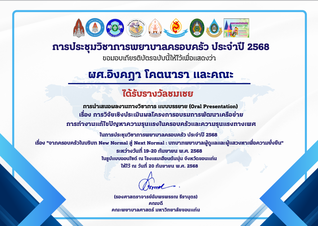 ในโอกาสได้รับ รางวัลชมเชย จากการนำเสนอผลงานวิชาการแบบบรรยาย (Oral Presentation)