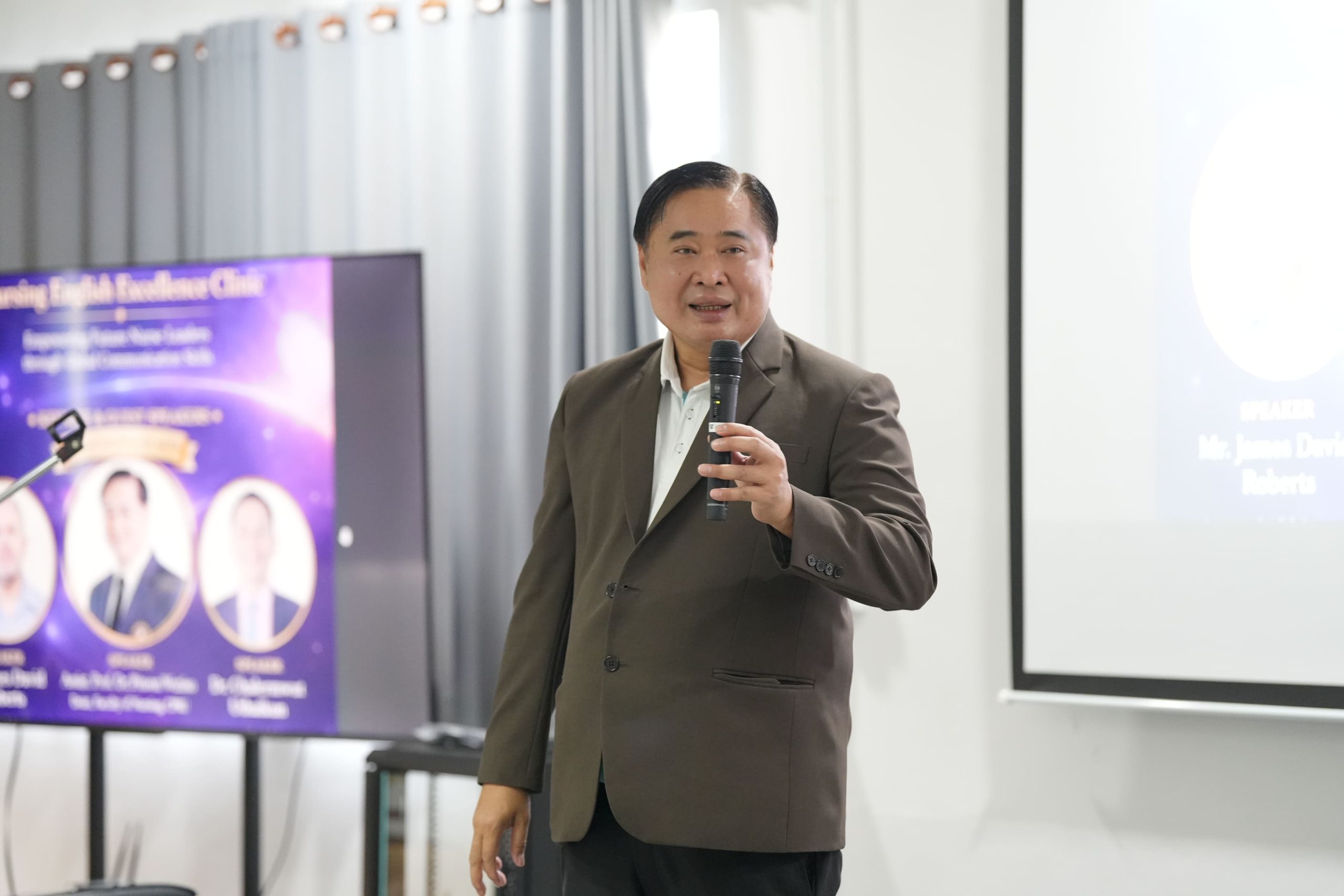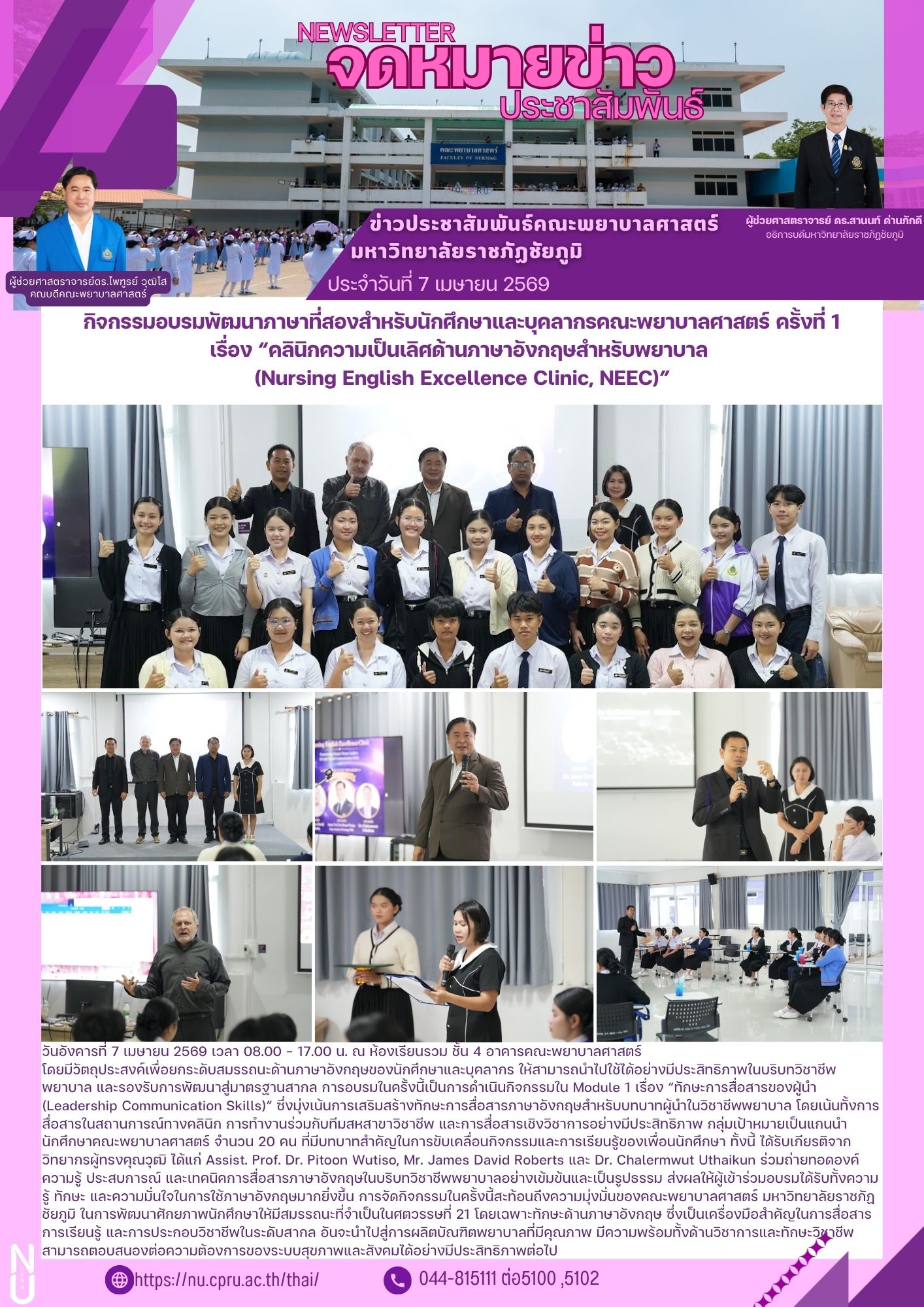 กิจกรรมในครั้งนี้ได้รับเกียรติจากวิทยากรผู้ทรงคุณวุฒิ 3 ท่าน ได้แก่ Assist. Prof. Dr. Pitoon Wutiso, Mr. James David Roberts และ Dr. Chalermwut Uthaikun ร่วมถ่ายทอดองค์ความรู้และเทคนิคการใช้ภาษาอังกฤษอย่างเข้มข้น ช่วยสร้างความมั่นใจให้แก่ผู้เข้าร่วมอบรมในการก้าวสู่การเป็นบัณฑิตพยาบาลที่มีคุณภาพในระดับสากล